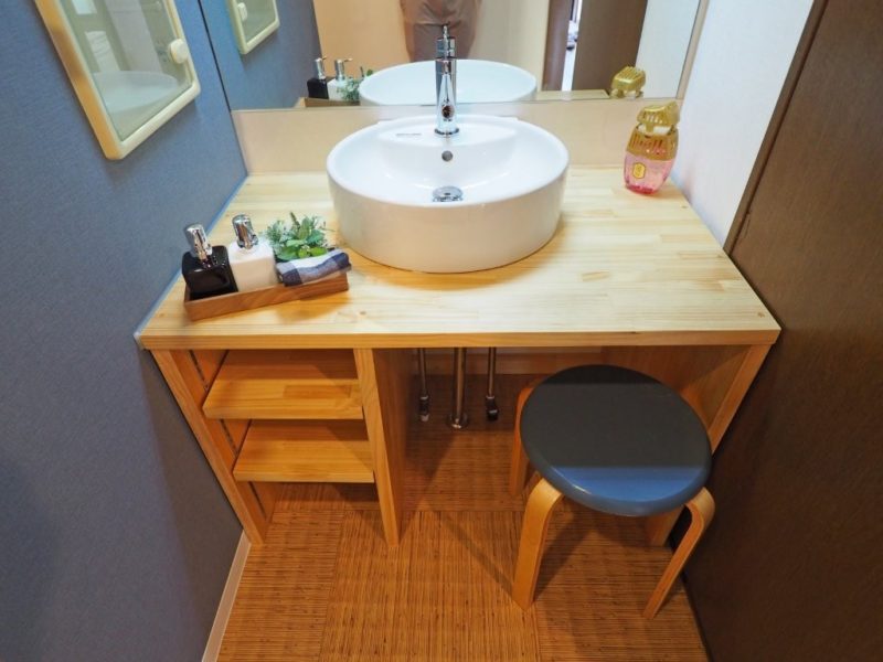 古いものを活かしながら住みやすい空間へ改装するアンドホームズオリジナルのbrocanteリノベーションを実施。キッチン扉や洗面台は無垢材を使用した造作。全体的に北欧を意識し彩度の低いくすんだブルーを中心にカラーコーディネートを行いました。